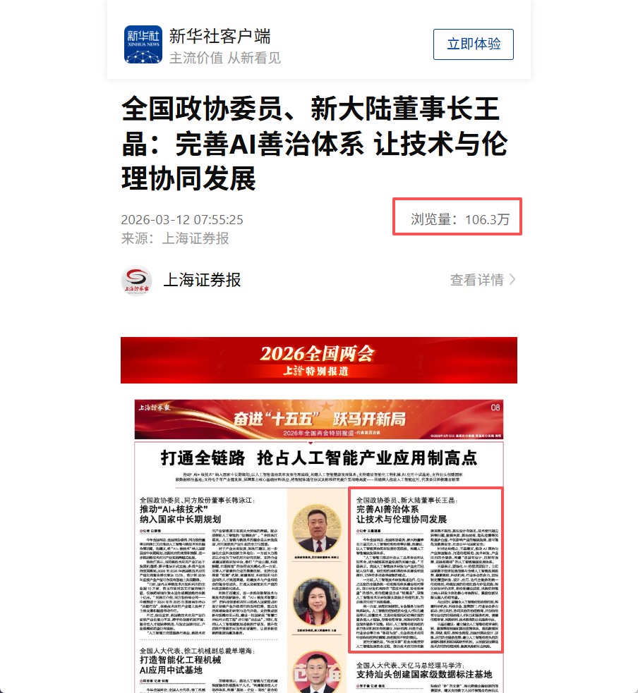 新华社刊发上海证券报《全国政协委员王晶:完善AI善治体系 让技术与伦理协同发展》,单篇阅读量已突破百万。