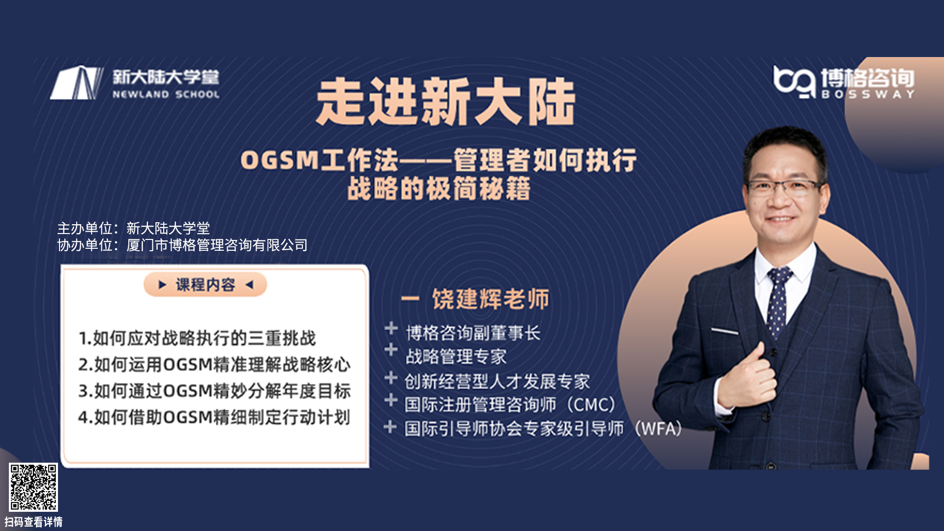 为了帮助员工深入理解战略执行的三重挑战,精细制定年度行动计划,优化运营效率,近日,www.乐鱼.com强陆营“走进www.乐鱼.com——OGSM导航:如何制定可落地的部门年度规划”沙龙分享活动圆满举行。www.乐鱼.com大学堂特邀请博格管理咨询公司副董事长饶建辉,以其在战略管理和创新型人才发展领域的丰富经验,为学员带来一场关于OGSM工具应用的培训,吸引了总部职能平台及各经营单位213位主管及以上人员参加。