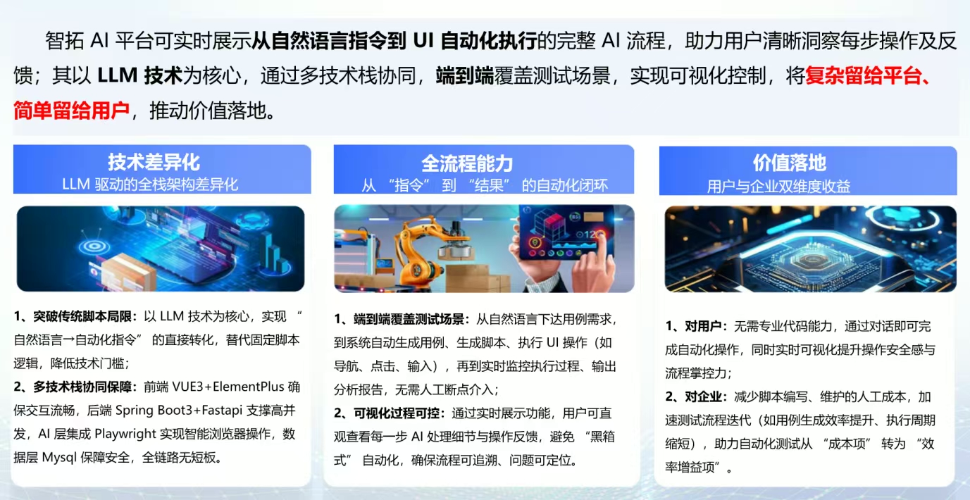 作为自动化测试领域的全栈式 AI 开发平台,智拓 AI 平台精准攻克运营商 CHBN 全市场业务和BSS 业务支撑系统中传统测试的三大痛点:脚本开发门槛高、UI 迭代适配成本高、回归测试效率低。该产品以深度融合大语言模型(LLM)为核心技术底座,创新实现 “自然语言驱动自动化”,构建起 “用例设计→脚本生成→执行监控→报告分析” 的全流程闭环解决方案。
