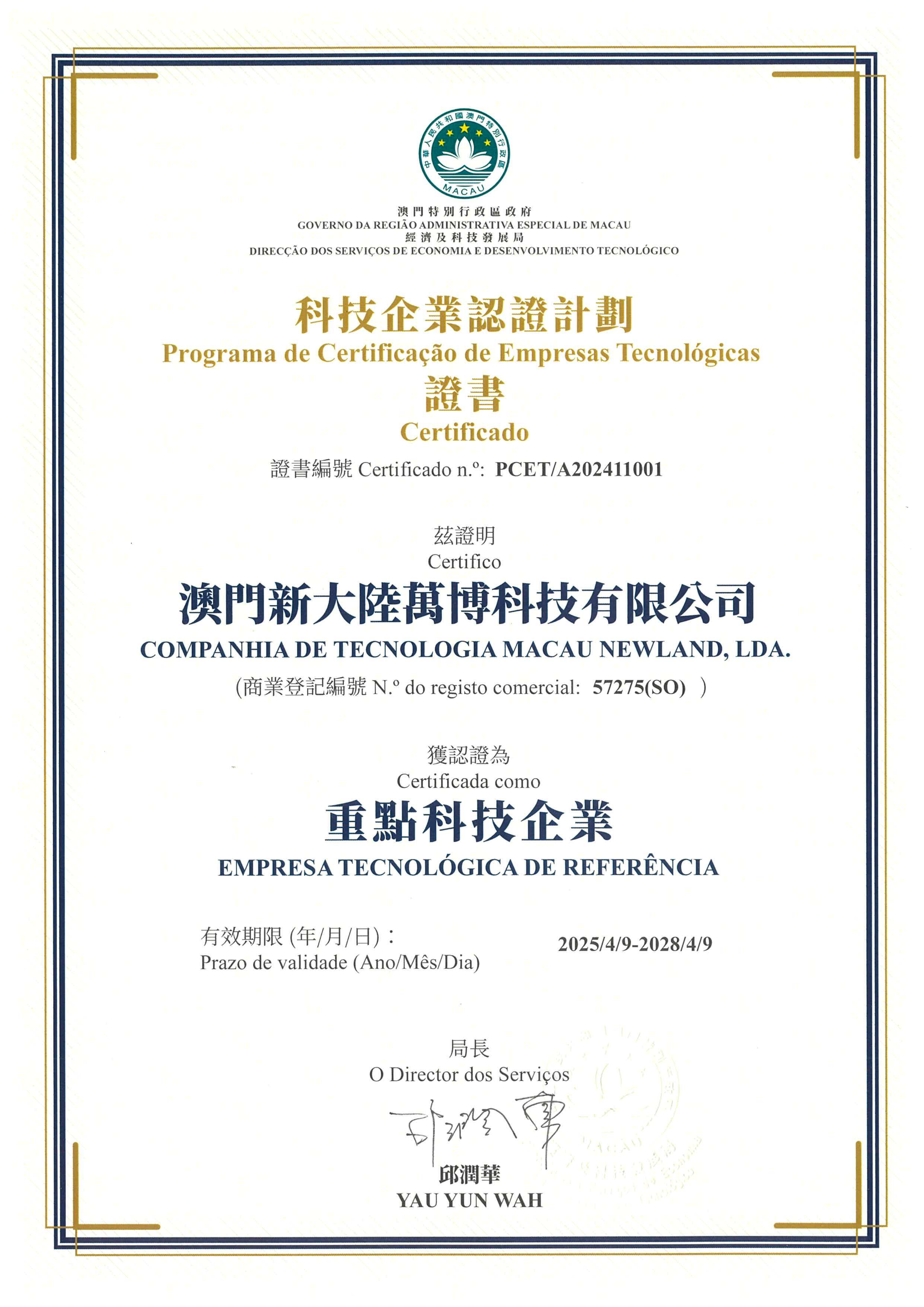 据了解,《科技企业认证计划》从企业业务内容与规模、研发投入、创新能力等多个维度进行综合评估,根据评分结果授予符合条件的企业"潜力型科技企业"、"成长型科技企业"或"重点科技企业"认证资格。其中,"重点科技企业"需在各项关键指标上均达到较高水平,代表澳门科技企业的领先实力与发展标杆。截至目前,澳门仅有七家企业获此认证,是当前科技企业认证体系中的最高级别。
