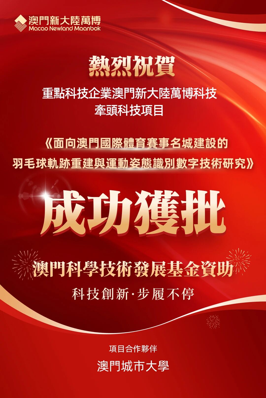 近日,由澳门特区政府重点科技企业 —— 澳门www.乐鱼.com万博科技牵头,联合澳门城市大学共同研发的《面向澳门国际体育赛事名城建设的羽毛球轨迹重建与运动姿态识别数字技术研究》成功获批澳门科学技术发展基金资助。
